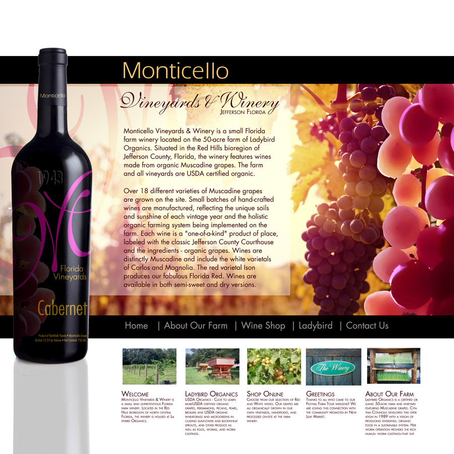 Proposed web designs for a Florida vineyard. Monticello Vineyards & Winery is a small and unpretentious Florida farm winery. Located in the Red Hills bioregion of north central Florida, the winery is housed at Ladybird Organics. Their grapes are all organically grown in a family own vineyards, handpicked, and processed on-site at the farm winery.